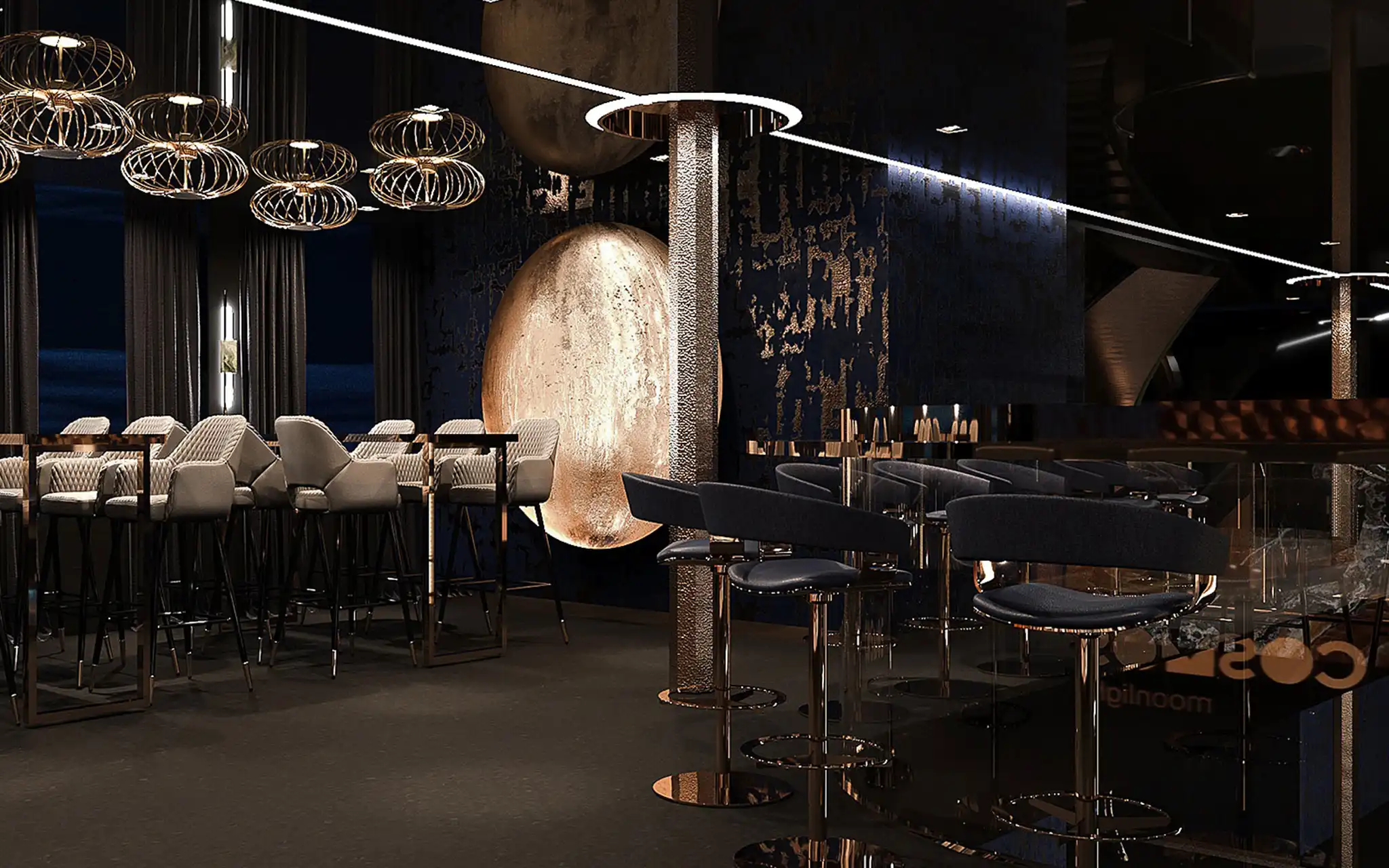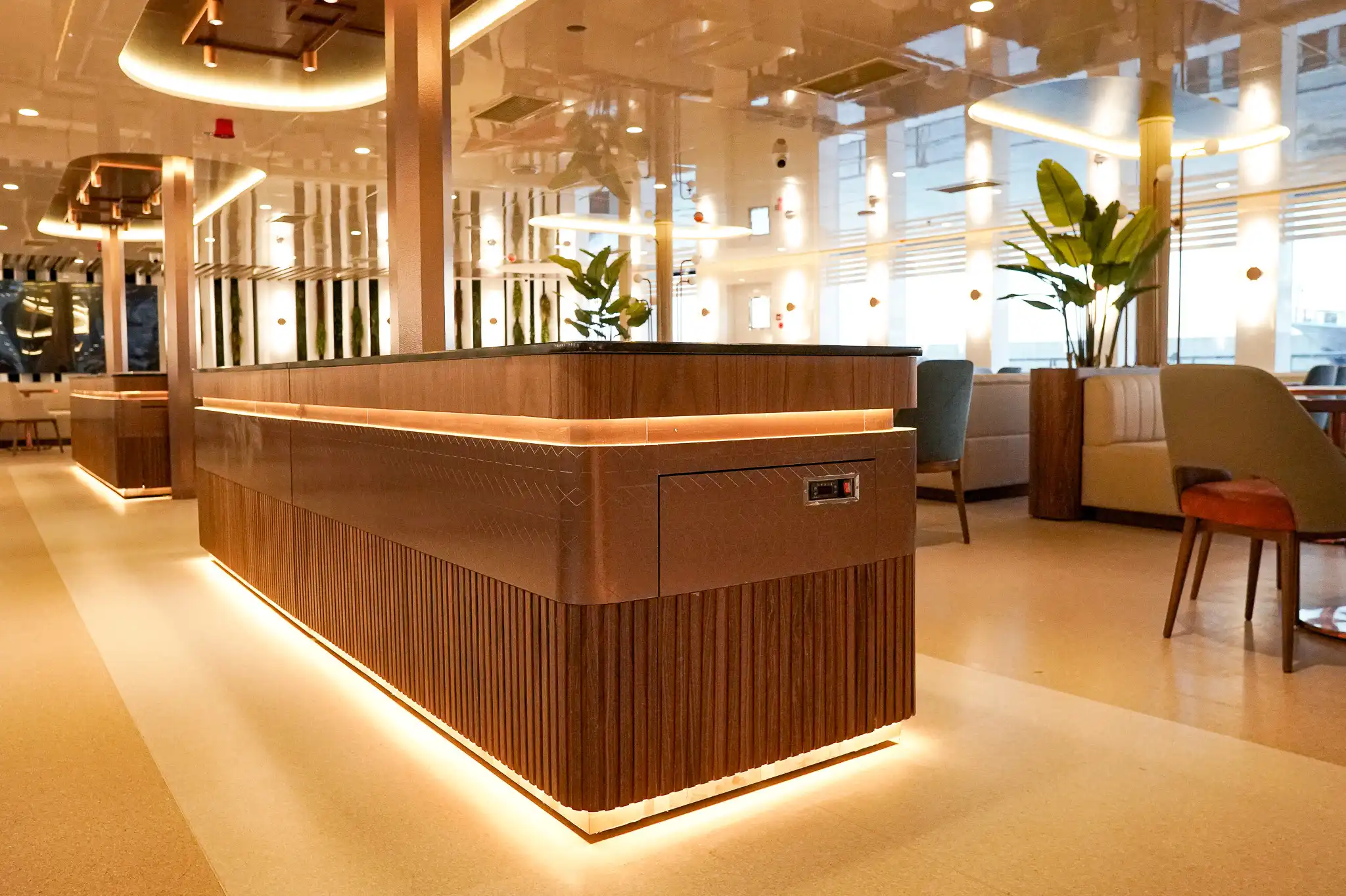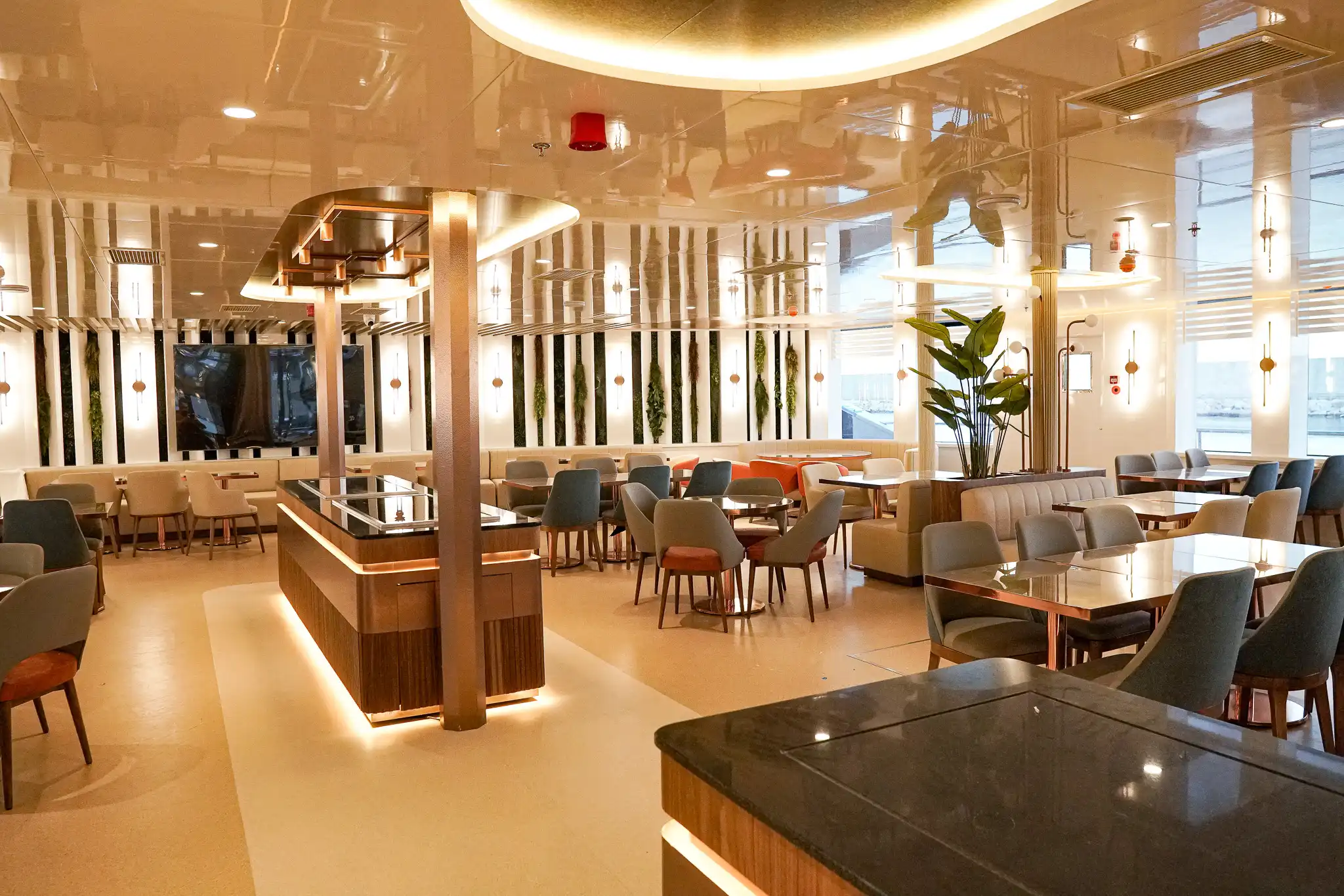 Mega katamaran COSMOS MOONLIGHT, misafirlerine gündüz ve gece hat dekorun muhteşem ahşap ve dekorasyon uygulamaları ile misafirlerine hizmet vermektedir.